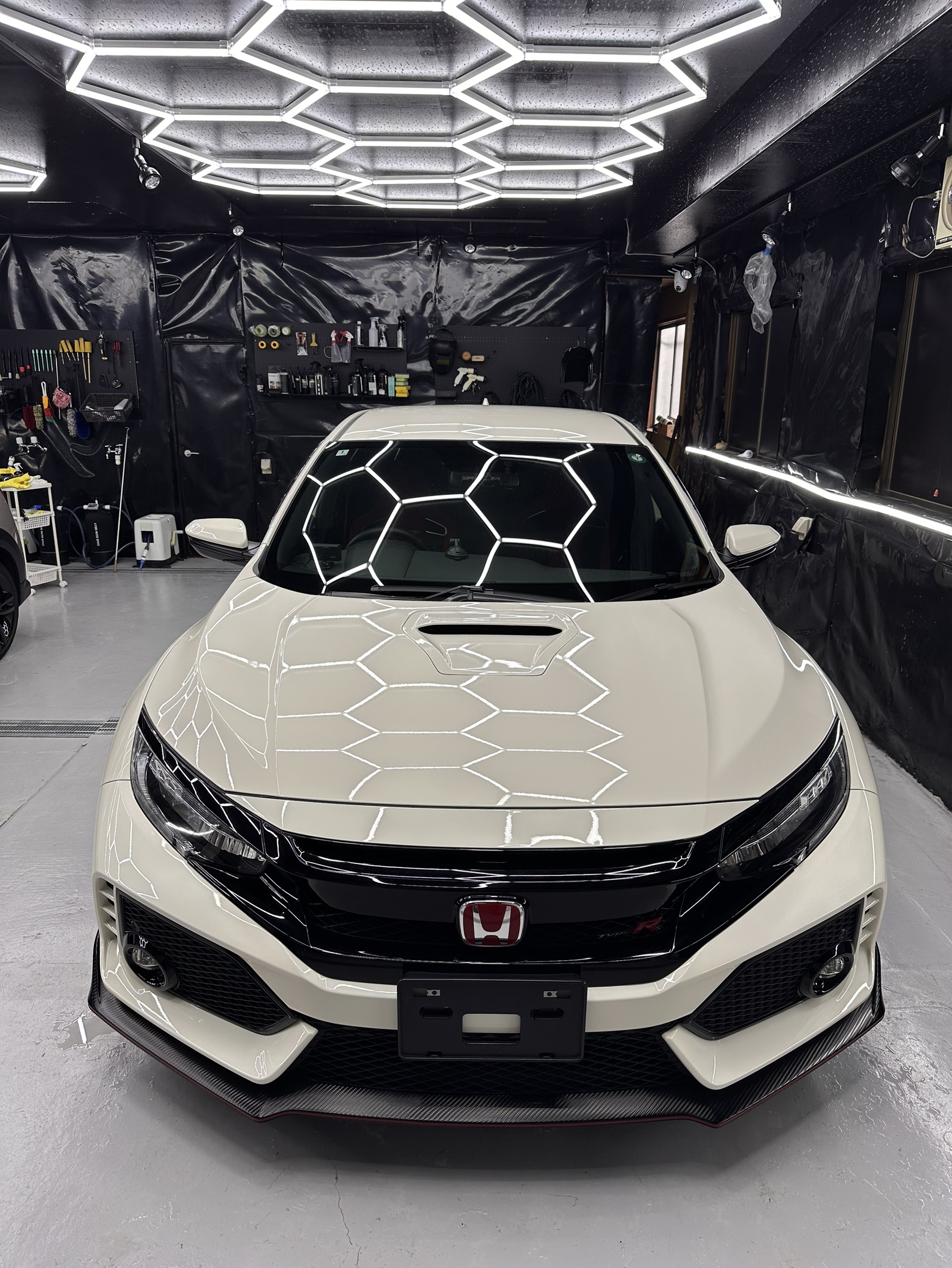 倉敷市のシビックタイプRのオーナー様より、研磨とグラフェンコーティングを中心に施工し、同時にホイールコーティングのご依頼をいただきました。(ホイールコーティングの詳細は別投稿にてご紹介しています。)
